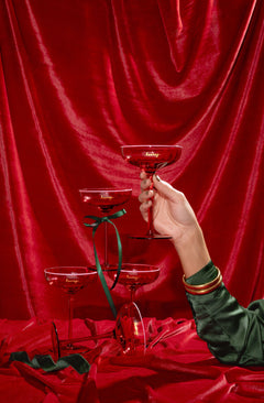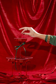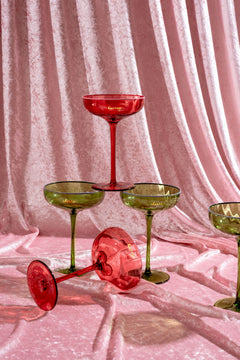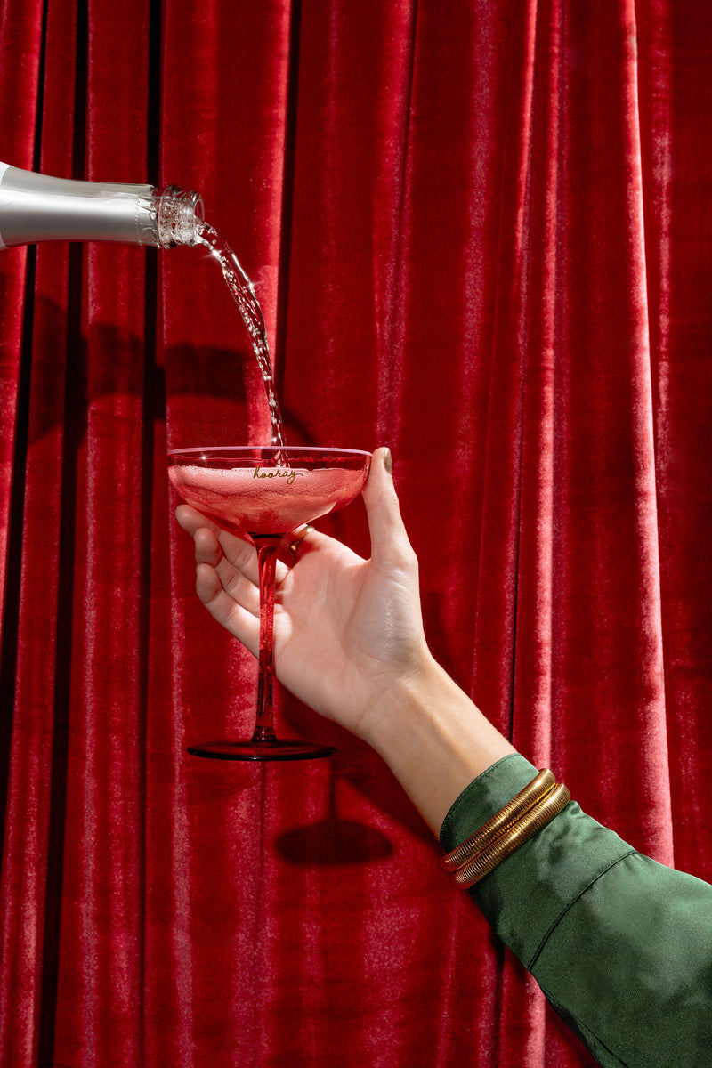 6 oz colorful lead-free crystal coupe glass. Gold inscription reads "Hooray!" Celebrate milestones and achievements with this striking coupe, designed in a bold cherry red hue with a matching base and a pink rim. A festive choice for showers, birthdays, and special events. Hand wash only.